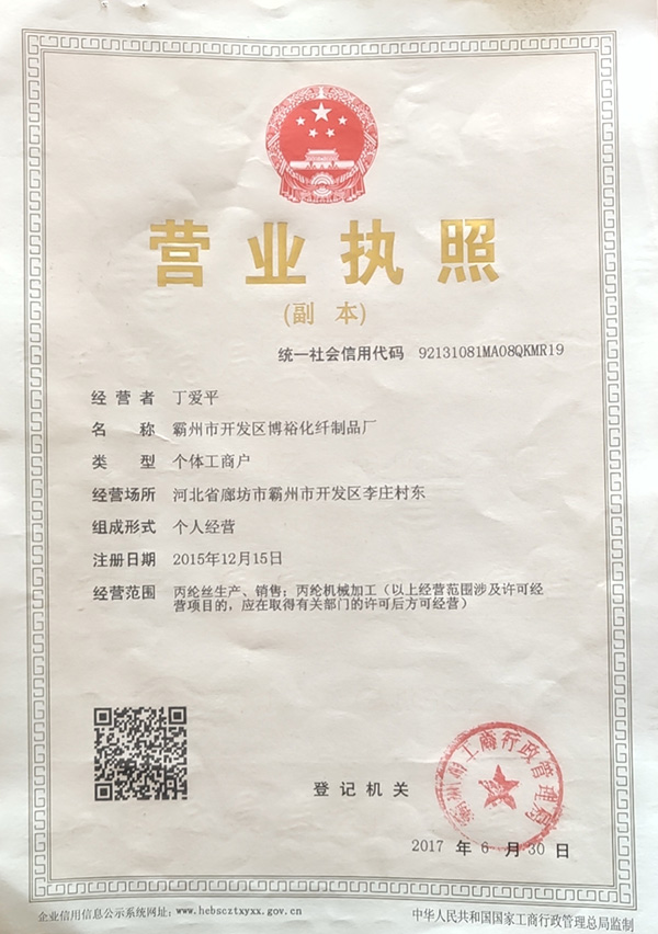 Strong technical force and advanced production technology 霸州市開發區博裕化纖制品廠是一家生產丙綸長絲的大型企業,擁有先進的紡絲生產線,現有技工8名,職工200多名,形成華北地區產量較大、品種較全、技術力量雄厚、生產工藝先進,以生產300D—1800D各種中、高、強丙綸長絲為主導產品